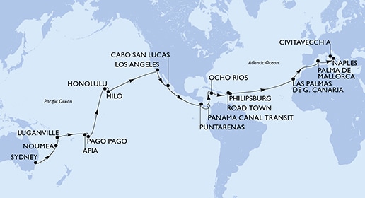 Маршрут круиза: Сидней - море - море - Нумеа - море - Луганвилл - море - море - море - Апиа, о. Уполу - Паго-Паго, о. Тутуила - море - море - море - море - море - Гонолулу, о. Оаху - Хило, о. Биг-Айленд - море - море - море - море - море - Лос-Анджелес - море - море - Кабо-Сан-Лукас - море - море - море - Пунтаренас - море - Панамский канал - Панамский канал - море - Очо-Риос - море - море - Род-Таун, о. Тортола - Филипсбург, о. Синт-Мартен - море - море - море - море - море - море - Лас-Пальмас, о. Гран-Канария - море - море - о. Майорка - море - Неаполь / Помпеи - Чивитавеккья / Рим