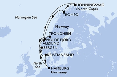 Маршрут круиза: Гамбург - море - Олесунн - море - Хоннингсвог - Хоннингсвог - Тромсё - море - Молде - Тронхейм - Берген - Кристиансанн - море - Гамбург