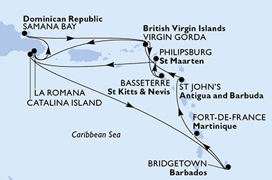 Маршрут круиза: Ла-Романа - Самана полуостров - о. Верджин-Горда - Филипсбург, о. Синт-Мартен - Бастер, о. Сент-Китс - море - о. Каталина - Ла-Романа