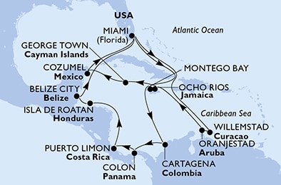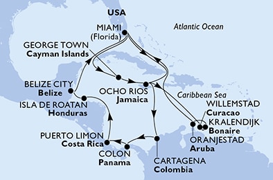 Маршрут круиза: Майами - море - море - Кралендейк, о. Бонэйр - Ораньестад, о. Аруба - Виллемстад, о. Кюрасао - море - Кабо Рохо - Очо-Риос - море - Майами