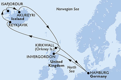 Маршрут круиза: Гамбург - море - Инвергордн - море - Рейкьявик - Рейкьявик - Исафьордюр - Акюрейри - море - Керкуолл, Оркнейские острова - море - Гамбург