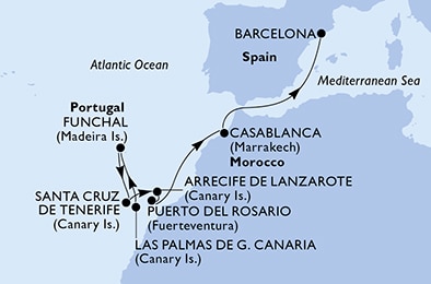 Маршрут круиза: Лас-Пальмас, о. Гран-Канария - Фуншал, о. Мадейра - Санта-Крус-де-Тенерифе, о. Тенерифе - Аресифи, о. Лансароте - Пуэрто-дель-Росарио, о. Фуэртевентура - море - Касабланка - море - Барселона