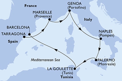 Маршрут круиза: Таррагона - Марсель - Генуя / Милан - Неаполь / Помпеи - Палермо, о. Сицилия - Ла-Гулетт - море - Барселона