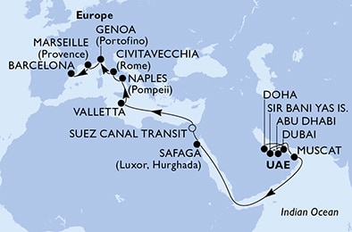 Маршрут круиза: Доха - Дубай - Дубай - Дубай - Абу-Даби - о. Сир-Бани-Яс - море - Маскат - море - море - море - море - море - Сафага - Суэцкий Канал - Суэцкий Канал - море - море - Валлетта - Неаполь / Помпеи - Чивитавеккья / Рим