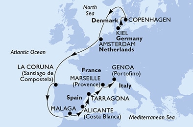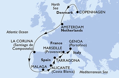Маршрут круиза: Копенгаген - море - Амстердам - море - море - Ла-Корунья - море - Малага - Аликанте - Таррагона - Марсель - Генуя / Милан