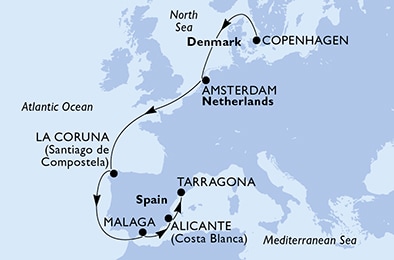 Маршрут круиза: Копенгаген - море - Амстердам - море - море - Ла-Корунья - море - Малага - Аликанте - Таррагона