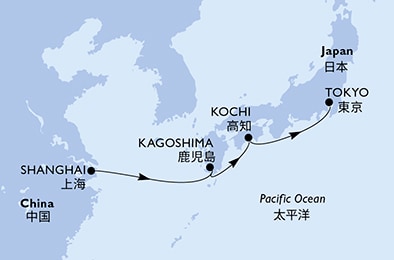 Маршрут круиза: Шанхай - море - Кагосима - Кагосима - Коти - Коти - море - Токио - Токио