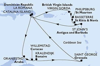 Маршрут круиза: Ла-Романа - о. Каталина - о. Верджин-Горда - Филипсбург, о. Синт-Мартен - Бастер, о. Сент-Китс - Сент-Джонс, о.Антигуа - море - Ла-Романа - о. Каталина - Ораньестад, о. Аруба - Виллемстад, о. Кюрасао - Кралендейк, о. Бонэйр - Сент-Джорджес, о. Гренада - море - Ла-Романа