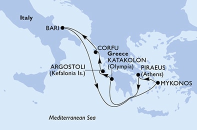 Маршрут круиза: Пирей / Афины - Катаколон / Олимпия - о. Кефалония - о. Корфу - Бари - море - о. Миконос - Пирей / Афины